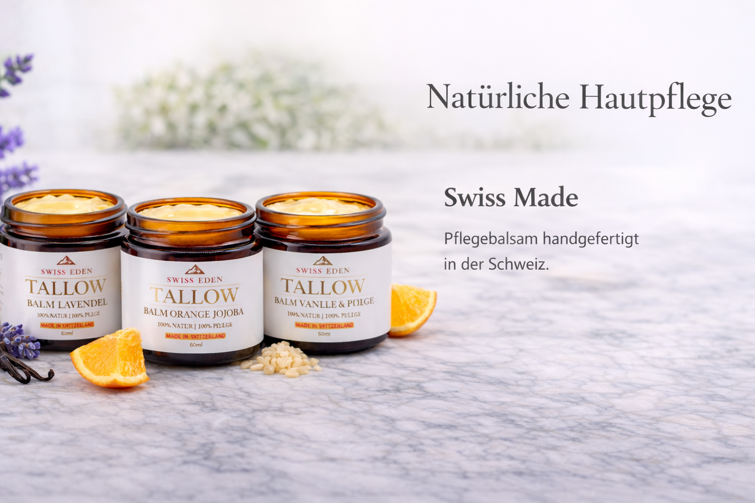 Swiss Eden ist nicht nur ein Unternehmen für uns – es ist eine Herzensangelegenheit. Als Familie haben wir uns dazu entschlossen, einen nachhaltigen Weg zu gehen und Produkte zu kreieren, die sowohl unserer Umwelt als auch der Haut gut tun.Unsere Reise begann mit der Liebe zur Schweizer Natur und dem Wunsch, die wundervollen Ressourcen der Region auf authentische Weise zu nutzen. Der Talg von Demeter -Weiderindern aus der Schweiz war die perfekte Grundlage für unsere ersten Produkte. Hierbei achten wir darauf, dass jedes Produkt natürlich und rein bleibt – ohne künstliche Zusätze und mit Liebe zur Handwerkskunst.